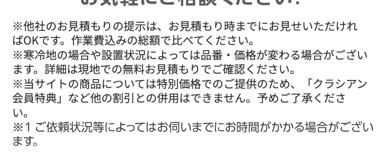 ※寒冷地の場合や設置状況によっては品番・価格が変わる場合がございます。詳細は現地での無料お見積もりでご確認ください。